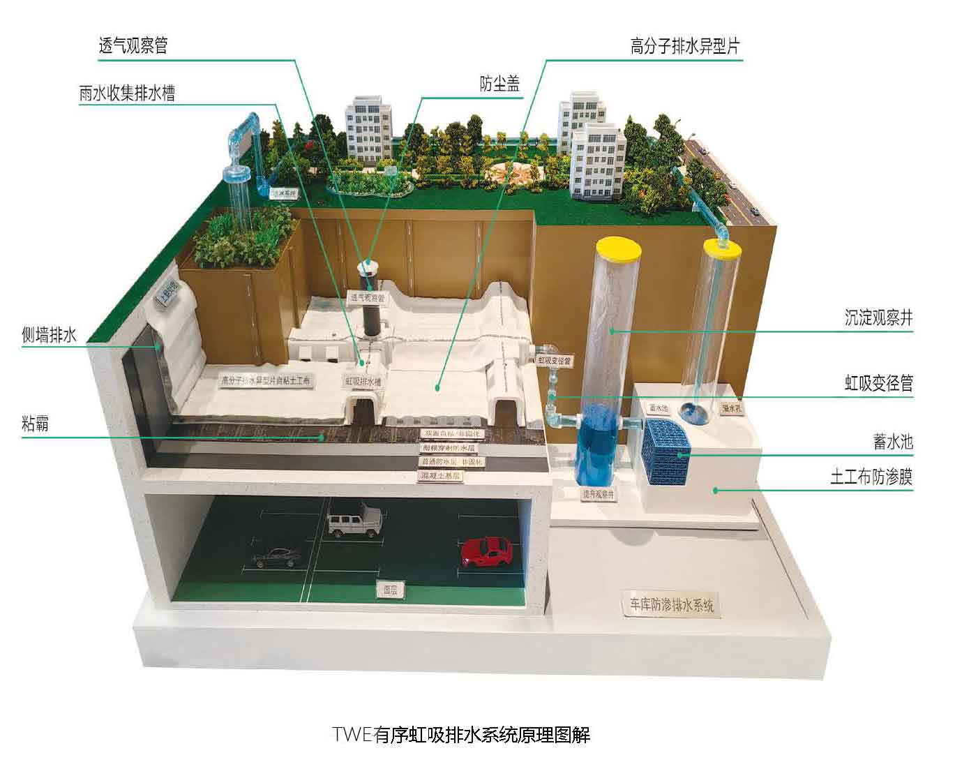 TWE有序虹吸排水系統(tǒng)原理:土壤中的水分通過滲透到達高分子防護排水異型片上方,水分經土工布過濾后流入高分子防護排(蓄)水異型片。水經高分子防護排(蓄)水異型片中的空隙不斷流至相鄰陷虹吸排水槽中。在虹吸排水槽上安裝透氣管,虹吸排水槽內的水在空隙、重力和氣壓作用下能很快匯集到相對應的出水口,出水口通過管道變徑的方式使虹吸直管形成滿流從而形成虹吸,在虹吸作用下,排水槽內的水不斷被吸入沉淀觀察井,流出頂板區(qū)域。流出的水分經觀察井排入雨水收集系統(tǒng)內,待晴天需要對綠化植物進行澆灌時再對雨水進行循王環(huán)利用。