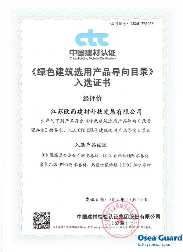 近日,歐西家建科四款產(chǎn)品“DTM聚酯復(fù)合防水卷材”、“LOCA自粘預(yù)鋪防水卷材”、“聚氯乙烯(PVC)防水卷材”、“熱塑性聚烯烴(TPO)防水卷材”獲得國(guó)家建筑材料測(cè)試中心頒發(fā)的《綠色建筑選用產(chǎn)品證明商標(biāo)準(zhǔn)用證》,并經(jīng)中國(guó)建材檢驗(yàn)認(rèn)證集團(tuán)評(píng)價(jià)成功入選《綠色建筑選用產(chǎn)品導(dǎo)向目錄》。