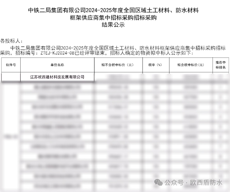 近日,中鐵二局集團有限公司完成了2024—2025年度全國區(qū)域土工材料、防水材料框架供應(yīng)商集中招標(biāo)采購招標(biāo),并公示了相關(guān)結(jié)果,其中,江蘇歐西建材科技發(fā)展有限公司成功入列。